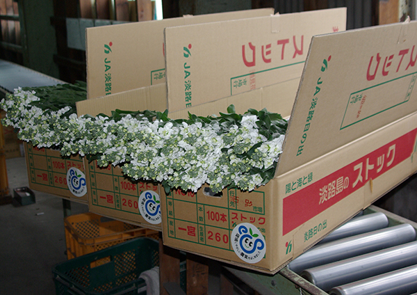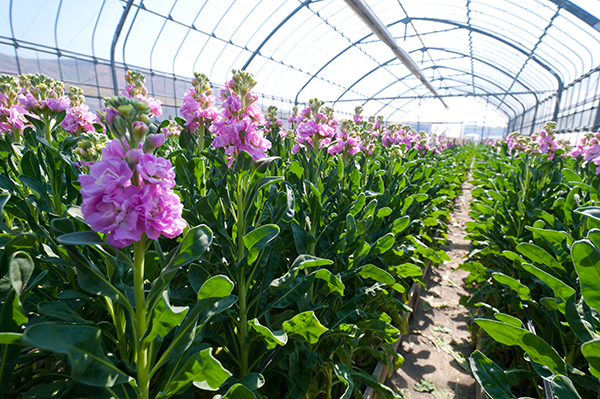 淡路島のストックは、他の産地と比べて茎が太くて硬くボリュームがあり、温暖な淡路島の気候を生かし2期作栽培をすることで、甘い香りの豪華な花を11月~5月まで長い期間お楽しみいただけます。